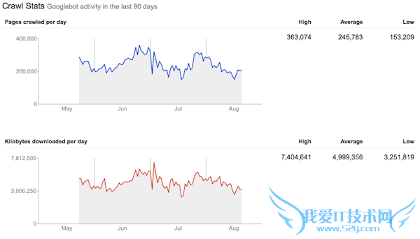 如下图,你可以从Google的网站管理员工具中知道,Googlebot的抓取频率与抓取量: