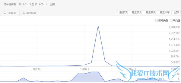 如“马年祝福语”这个关键词就是一个十分典型的例子,在其顶峰时指数高达“407366”(图1),然而几天后的今天,它的指数为“13627”(图2),这个关键词的爆发非常具有典型性,完整地体现一个关键词从诞生到发展再到逐渐低迷的结局(图3),非常值得我们留意。