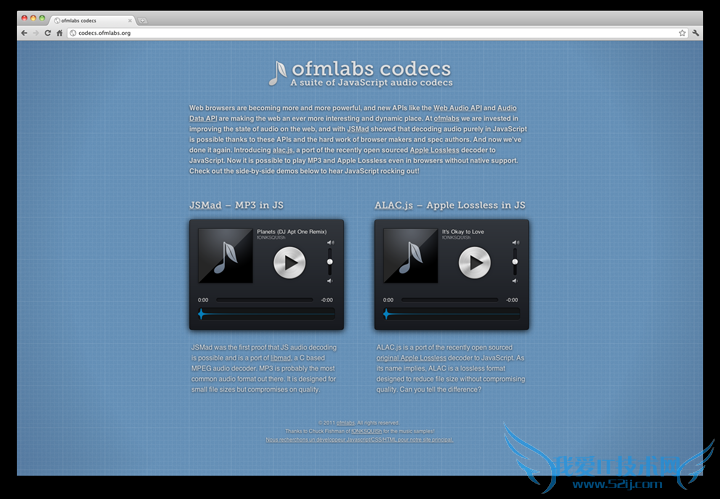 Ofmlabs 使用两个伟大的产品实现 JavaScript 音频解码技术:第一个名为JSMad,首次证明 JS 音频解码是可能的,是 libmad(一个基于C的 MPEG 音频解码器)的一个端口。第二个是 ALAC.js,是最近开放了源代码的苹果无损解码器的一个 JavaScript 端口。