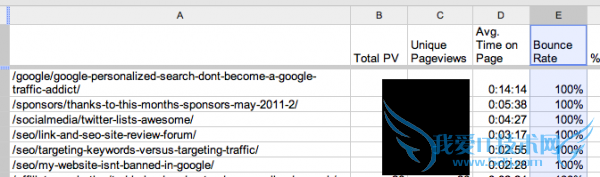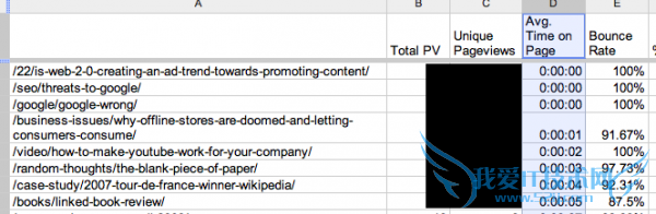 你可以看见跳出率十分高,如果你仅仅只关心跳出率,你可以将这些网页扔进回收站,并计划重新改写或删除它。同时,你只需要看着网页上的时间就行了。你能看见人们在这些网页上花费的时间,因为人们阅读了网页,这些网页就有了价值。