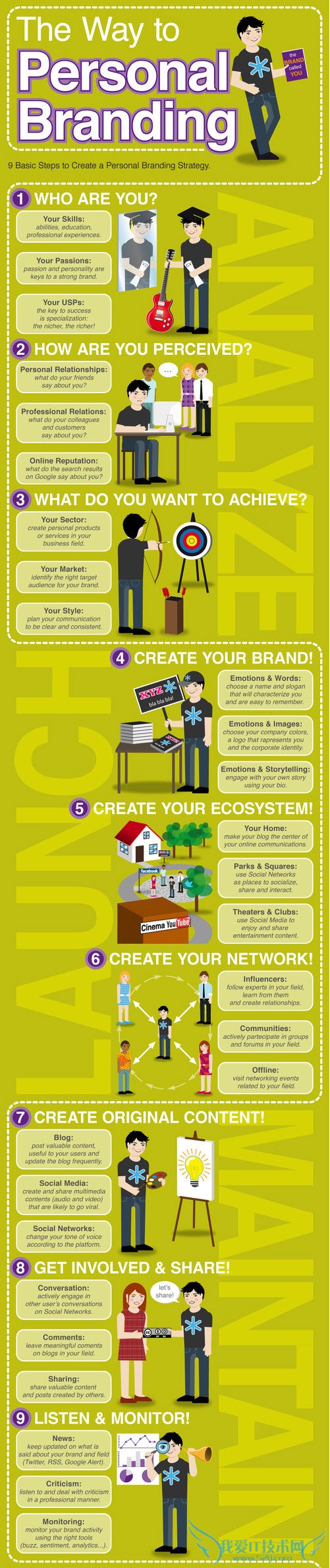 在我之前的《浅谈社会化媒体时代如何成就个人品牌?——找到你的兴趣》一问中,我提到了现在是创建个人品牌的最好机会,之所以这么说,是因为相比过去,现在这些社会化媒体工具的流行,在网上开个博客、创建微博已经是很小儿科的事情,这就让每个人都有机会表达自己的想法和观点,只要你愿意,一定有所收获。下面是来自 Jorgen Sundberg的一张信息图,讲述的就是创建个人品牌的9个基本步骤,我做参考写一些我对个人品牌的看法。