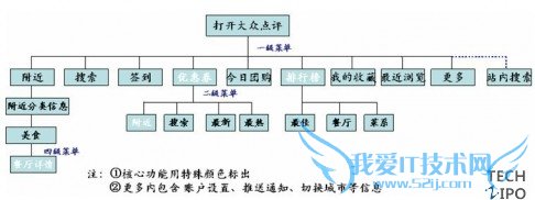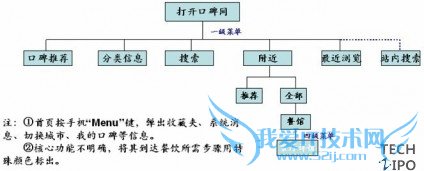 从设计框图上来看,大众点评功能更加明确,口碑网功能很多但是杂乱,因此没有画出。两者到达餐饮这一项,均均需经过四级菜单,在用户耐心范围之内,但大众点评还有别的通路可以较快到达餐饮,如优惠券等,而口碑网是将折扣集成到了每个餐馆的详情中,不够明确。