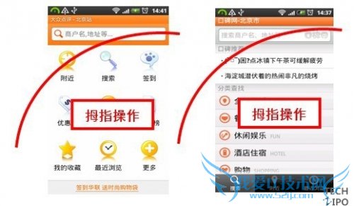 就单手操作拇指可覆盖范围来看,两者均能基本覆盖所有重要信息,但是大众点评网右下角区域按键不好操作。两相比较,口碑网更好,如下图: