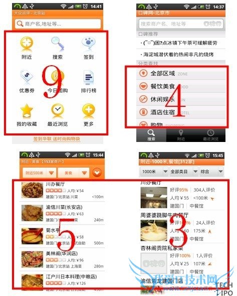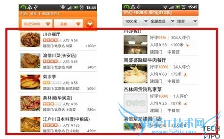 以上图中“附近美食”为例,大众点评对川办餐厅的有效描述包括:招牌菜图、星级、人均消费、地点、距离;口碑网有效描述包括:好评率、评价人数、人均消费、地点、距离、餐馆类型、方向等。