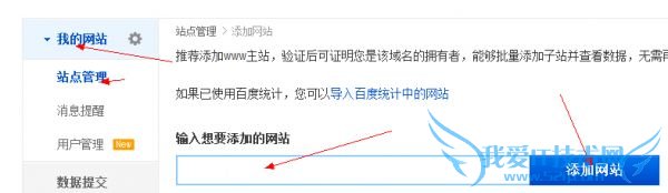 2、注册完成以后进去到百度站长平台,在左边的我的网站-站点管理-添加网站,然后输入你网站的域名,比如www.xxxx.com,并点击添加网站。如图所示: