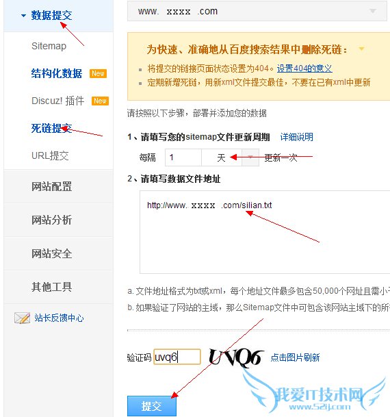 2、点击站长平台的数据提交-死链提交,在右边的对话框中输入文件的更新日期,可以选择1天,然后把死链接的路径输入进去,然后输入验证码,点提交,这样就大功告成了,所有的操作流程在下图中都可以看到。