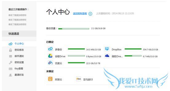 可以在右上角的个人中心里绑定想备份到的云,这是我觉得多备份最有特色的地方。另外还有密码修改、邀请好友加流量等常见功能。