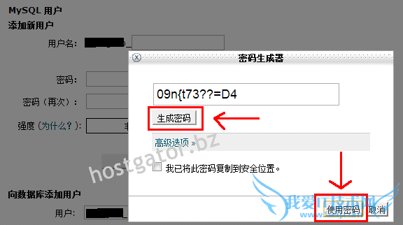 Hostgator主机的后台中创建数据库的页面就包含了一个密码生成器。