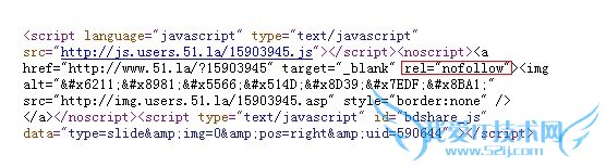 每个网站都会安装一些第三方的统计工具以便以网站的运营,这样的统计工具都属于站外链接,而且是属于全站的站外链接,这样容易造成网站本身的权重流失。所以有必要加上nofollow标识,避免本身网站的权重流失,而且这也不会影响统计工具的使用,下图以51统计为例,其它的统计工具也是一样的方法,主要运用于HTML的中,新手站长朋友可以照葫芦画瓢。