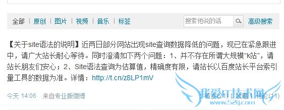 赶紧检查网站流量,咦,一切正常,流量并没有减少,关键词也没有下降,访问来路什么都没什么大的变化,但是还是惊魂不定,说不准明天就没流量了,我想作为站长,这会谁也没法淡定吧。于是着手又检查另外一个站,发现同样情况,SITE语法显示收录数据比之前下降至少10万左右,难道是百度出错了?经过多方面核实,果然是百度的SITE语法有出错现象,同时也得到了百度官方的证实,下图为百度站长平台官方微博的截图: