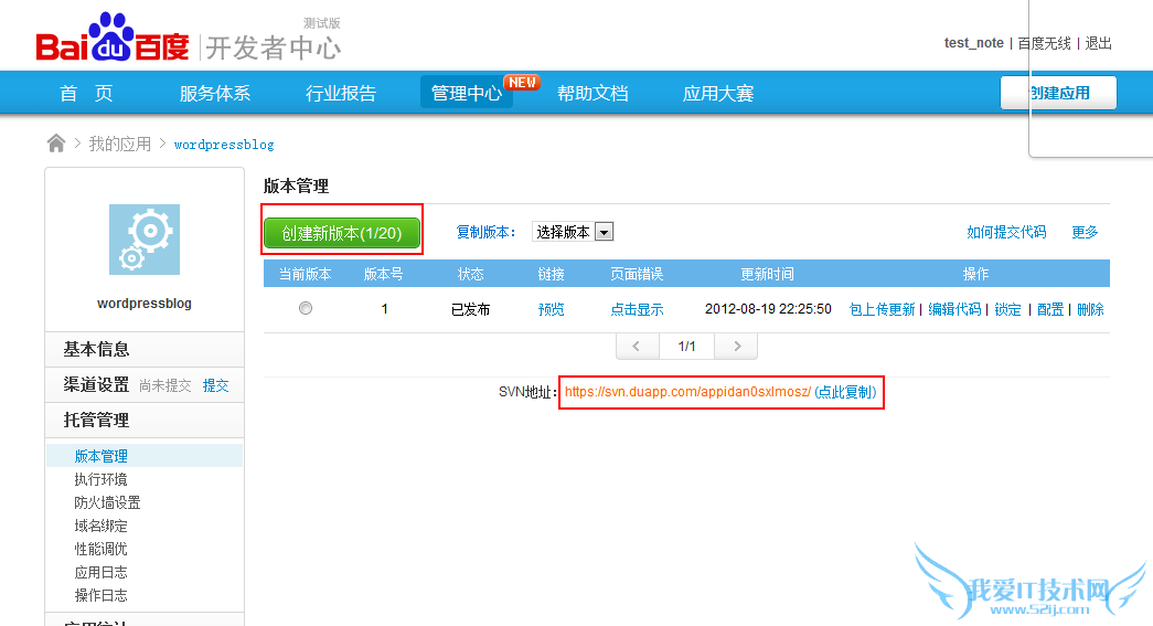 点击“管理” —>“创建新版本”按钮,获得SVN地址: