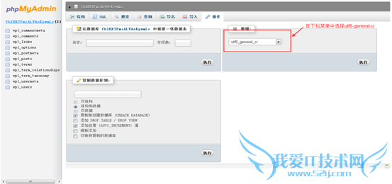 点击“phpMyadmin”后,点击“操作”,修改数据库字符集,界面如下: