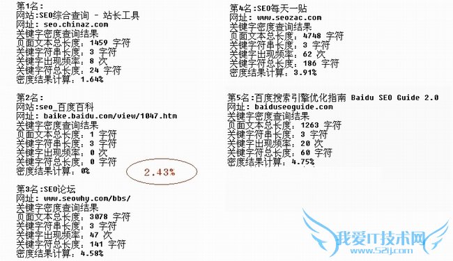 从上面的几个网站的关键词密度分别为, 站长工具 1.64%, 百度百科 2.43%, SEO论坛4.58%, SEO每日一帖 3.91%, 百度搜索引擎优化指南 4.75%。