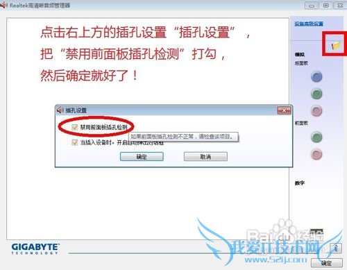 style="margin: 0cm 0cm 0pt;" >第六步:点击右上方的插孔设置“插孔设置”,把“禁用前面板插孔检测”打勾,然后确定就好了!