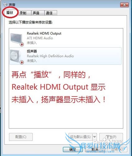 第三步:再点“播放”,同样的,Realtek HDMI Output 显示未插入,扬声器显示未插入