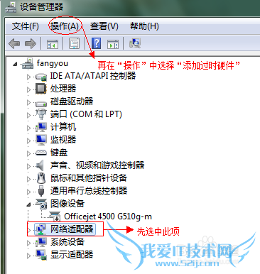 在下边选中“网络适配器”。然后在菜单栏的“操作(A)”中选择“添加过时硬件”,