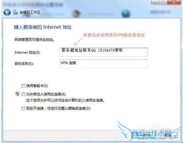 第六步:“Internet地址”栏填写VPN服务器的地址,“目标名称”填写“VPN连接”,点击下一步