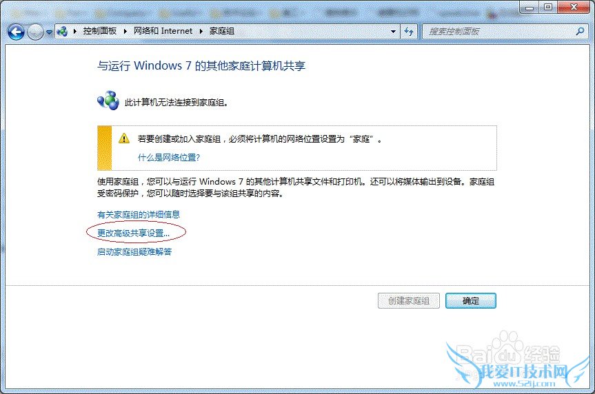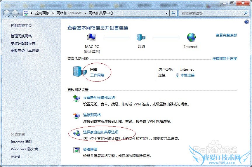 参考资料:更多Win7系统网络和共享中心打开方法 2、在弹出的网络和共享中心窗口中,记住所处的网络类型(笔者的是工作网络),接着在弹出中窗口中单击【选择家庭组和共享选项】。