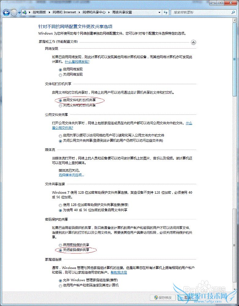 4、如果是家庭或工作网络,【更改高级共享设置】的具体设置可参考下图,其中的关键选项已经用红圈标示,设置完成后不要忘记保存修改。