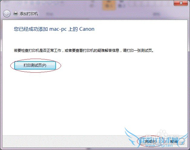 4. 至此,打印机已添加完毕,如有需要用户可点击【打印测试页】,测试一下打机是否能正常工作,也可以直接点击【完成】退出此窗口,如下图: