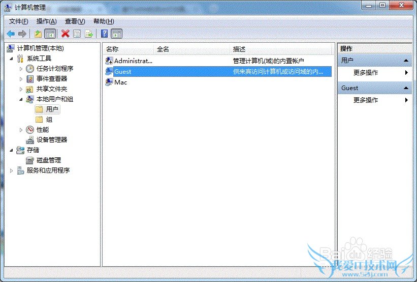 2、在打开的【计算机管理】窗口左侧菜单栏中找到并单击【本地用户和组】下面的【用户】,在右侧找到【Guest】用户,双击Guest用户或在Guest用户上右键属性。