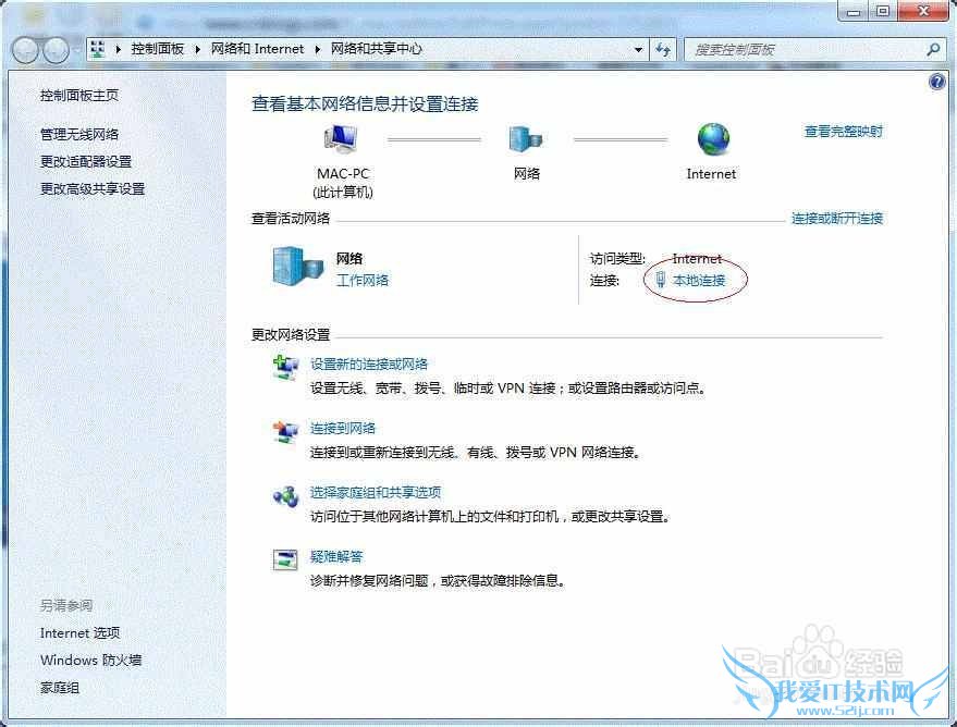 1.2 在【网络和共享中心】找到【本地连接】,单击,如下图: