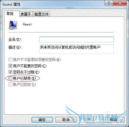 3. 在打开【Guest属性】的窗口中,检查【账户已禁用】前面是否没有勾选,一定要保证这个未勾选才行。如果勾选中的话就把勾去掉确定即可。
