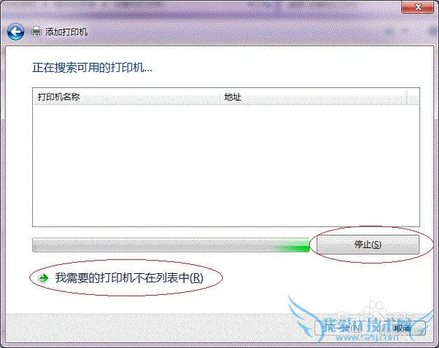 3、如果你没有什么耐性的话,可以直接点击【停止】,然后点击【我需要的打印机不在列表中】,接着点击【下一步】。