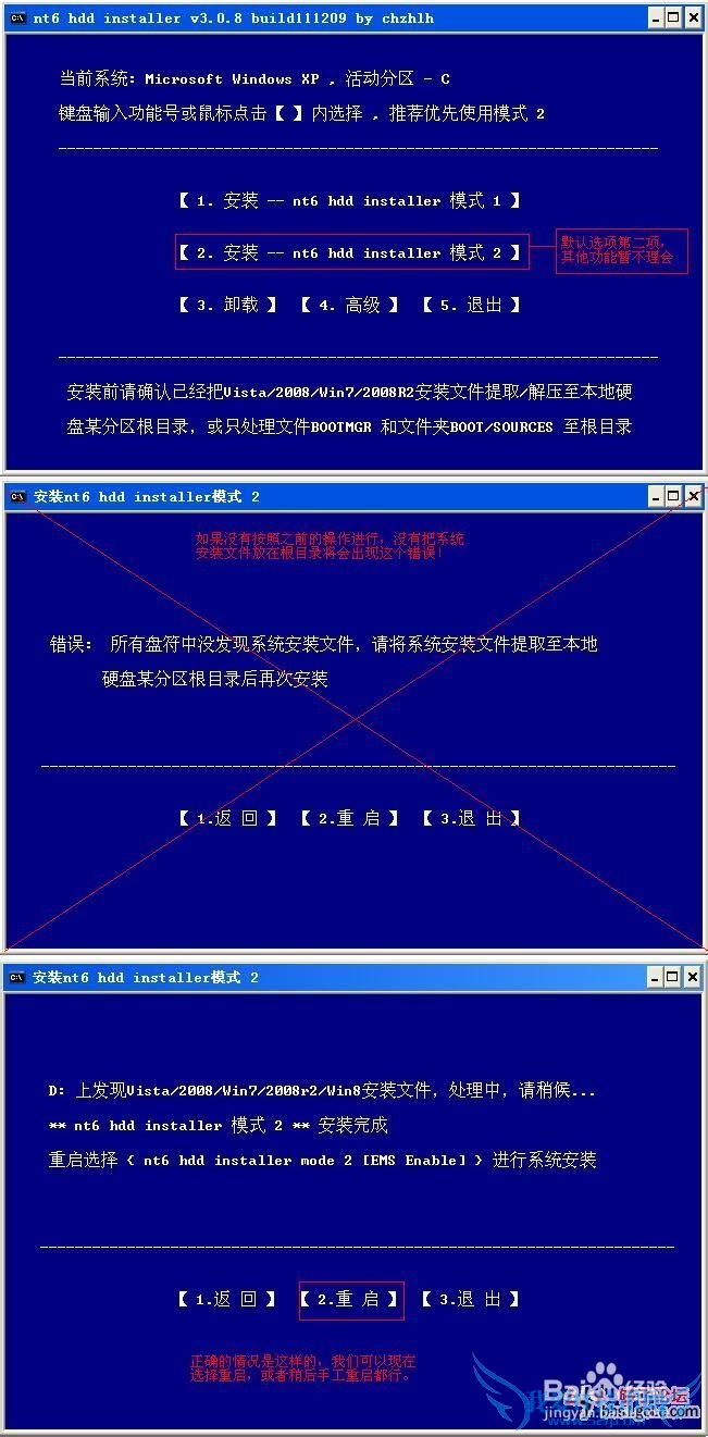 安装模式1时“安装模式1”和“解压系统安装文件至根目录”的操作没有先后之分,而安装模式2时需要先“解压系统安装文件至某分区根目录”后才可以“安装模式2”