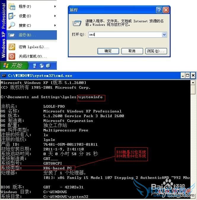 点击开始菜单,在“运行”框里输入“cmd”,确定,在打开的cmd窗口中输入“systeminfo”按确定,命令均不含引号。之后的几秒系统开始检测系统系统,很快就出现了一堆数据往下滚动,我们把滚动条拉到最上边,看显示的信息。找到“系统类型”那一行,我们可以清楚的看到自己的系统是几位的,X86就是32位系统,X64就是64位系统。[电脑技术]