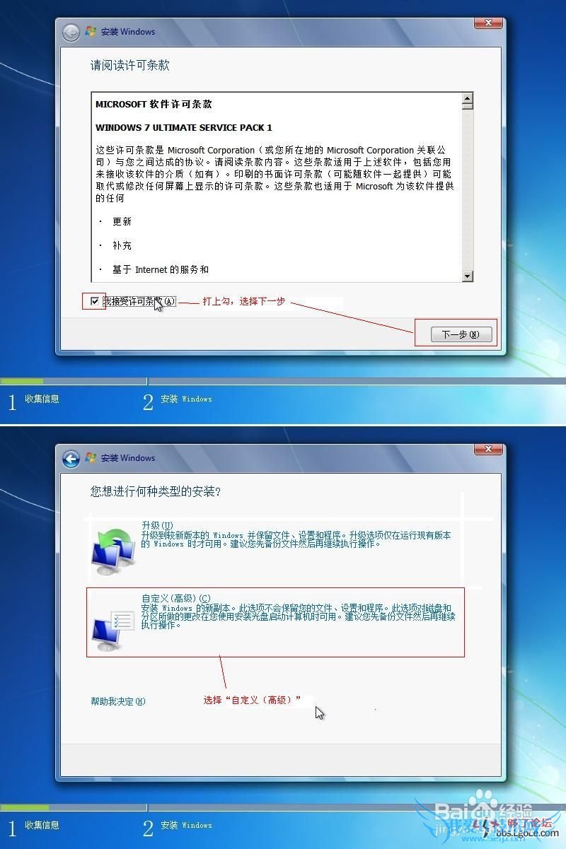 许可条款这一步,我们肯定必须打个对勾,点下一步;“您想进行何种类型的安装?”这里强烈选择“自定义(高级)”!如果点击“升级”的话,会保留之前系统的数据,速度非常慢,虽然装完系统之后之前安装的程序还在,但是很有可能出现兼容问题,导致无法使用,系统内部文件也会很混乱,最后是一团糟,经常出现各种奇怪的问题。