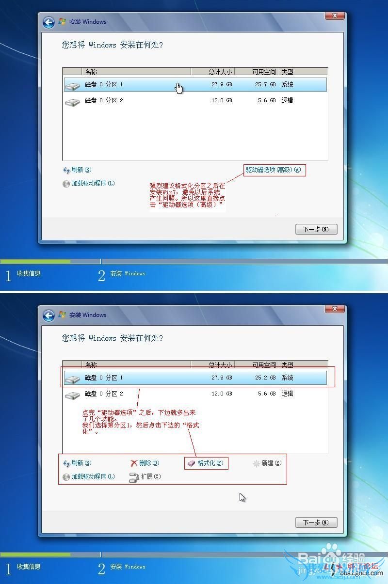 “您想将Windows安装在何处?”这里我们要选择哪个分区了,建议先点“驱动器选项(高级)”,前边说了,我们是从Xp下进行全新安装的,所以选择分区1,并点击下方的格式化,千万不要选错分区,否则格式化之后数据就没了。