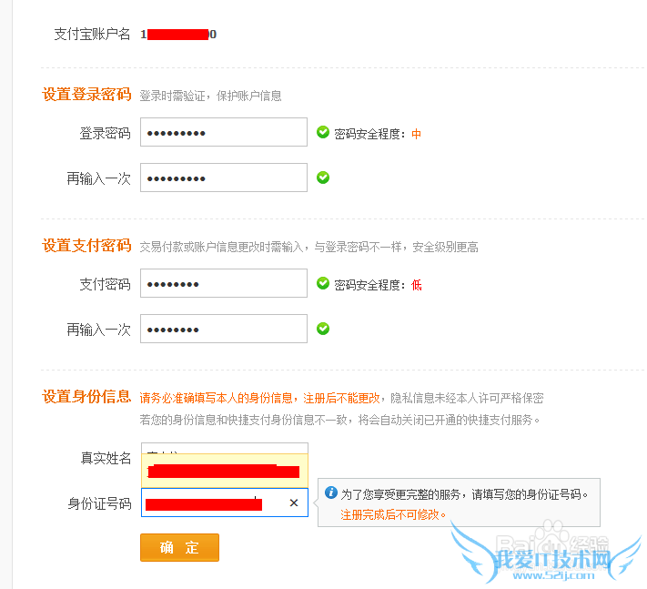 设置登陆密码,支付密码以及输入真实姓名和身份证号码;如图: