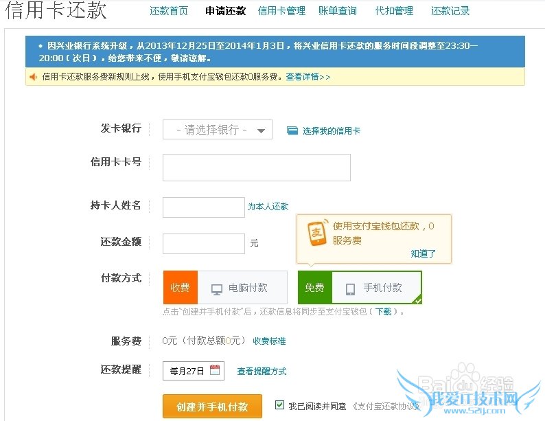 以此填入发卡银行,信用卡号,持卡人姓名,还款金额,收款方式建议选择手机付款(没有手续费哦)。填写完后,点击创建并手机付款。然后在手机支付宝可以看到清单,点击付款即可。