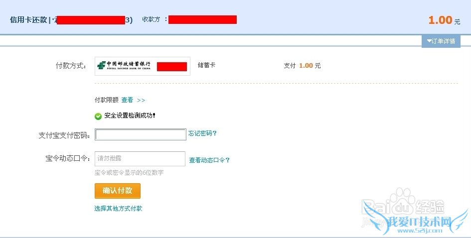 进入付款界面。输入自己的支付密码和动态口令就还款成功啦。动态口令是小编自己的一个安全验证方式,也是在支付宝手机软件里面。如果没有的话一般会有短信验证码,或者数字证书。