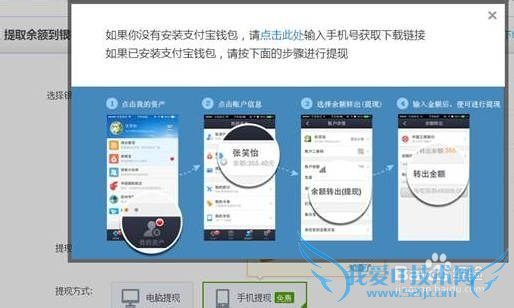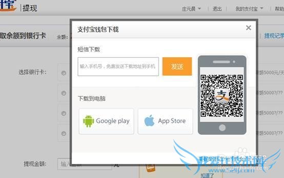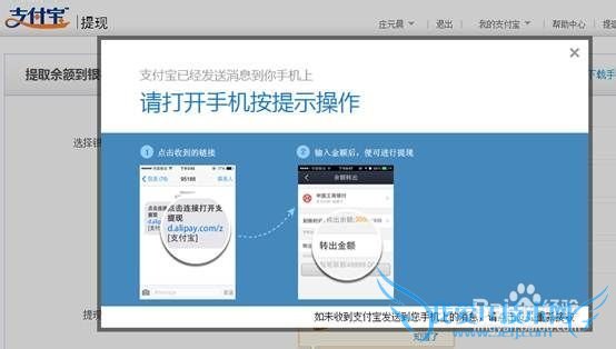 3、系统给用户发送Push/短信,同时浮层显示让用户查看手机进入客户端使用提现服务,另外可点击进入下载支付宝钱包;