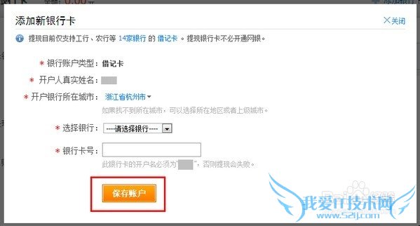 2、在【添加银行卡】页面,将银行账户信息填写完整,点击【保存账户】,若已设置提现银行卡,请直接到第三步操作;(提现银行账户必须与支付宝真实姓名一致)