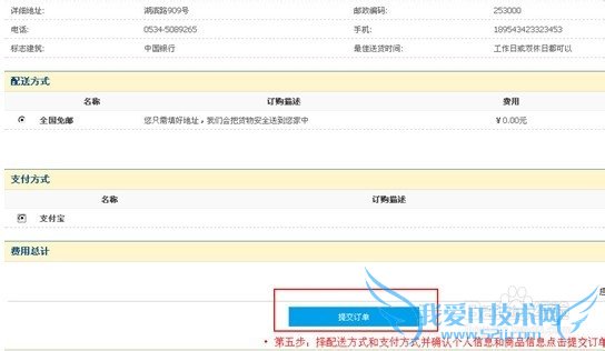 6、选择配送方式和支付方式并确认个人信息和商品信息点击提交订单