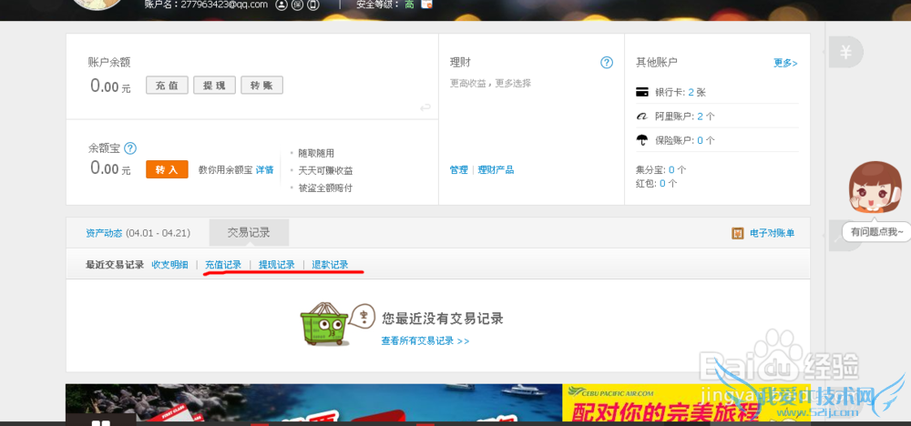 1.如果你要查找的是充值记录,提现记录,还有退款记录,只要你知道大概的时间范围很容易就能找出来,首先我们登录支付宝首页,交易记录是哪个类型就点击哪个类型,如我要查找“充值记录”就点击充值记录。