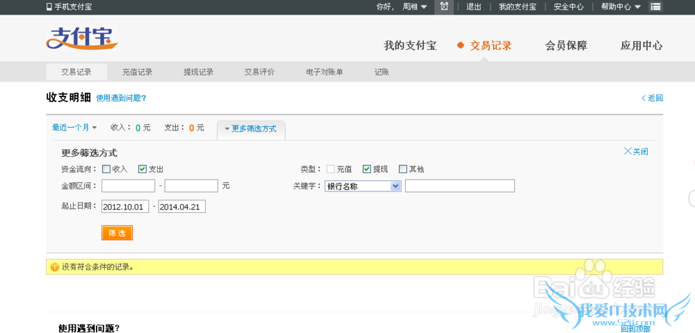 3.如实填写信息,交易属于什么类型就在那个类型前面打钩,金额区间就是指你要找的交易的价钱范围,起止日期也是指交易的日期。要是其中某一样不记得或者不知道,可以不用填。信息填写后,点击筛选就会出来符合要求的交易记录。如下图我找的是2012年10月到现在的提现记录。