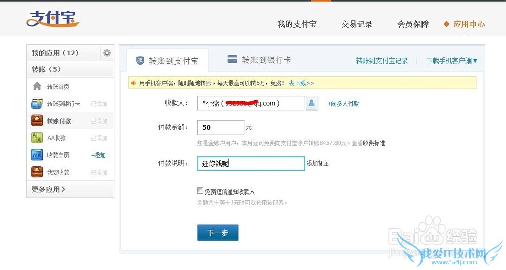 跳到支付宝,收款人是你还钱的地方。 我随便填。