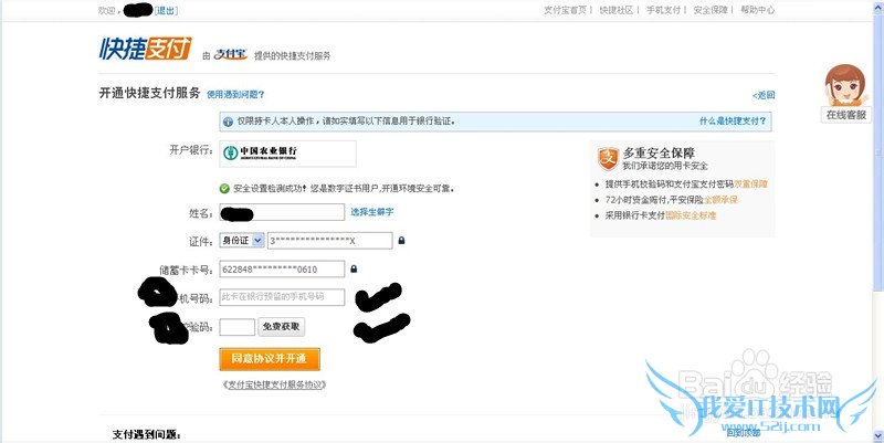 进入开通快捷支付信息详情界面,确认你所要开通的银行卡信息是否正确,下面有一个你在银行预留的手机号填一下,获取验证码,等下你的手机就会收到一条支付宝的验证码确认短信,把验证码填入下面的框框里面,然后就是点击“同意协议并开通”。