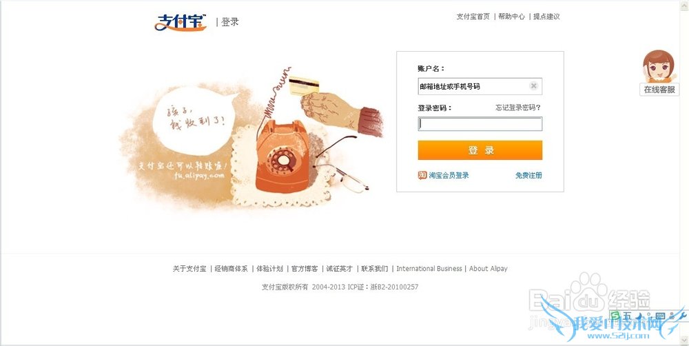 接下来就是打开你电脑的浏览器,输入支付宝的网址,用自己的帐号密码登陆支付宝,如下图。