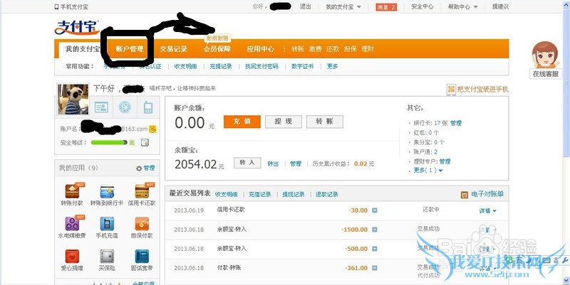 在我的支付宝界面上方导航有一个叫“帐户管理”,点击进入帐户管理界面。