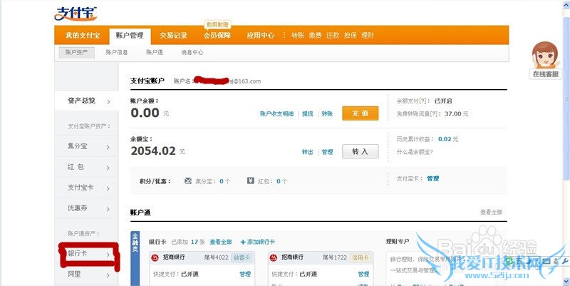在帐户管理界面的左侧下方有一个叫“银行卡”,点击进入银行卡管理界面。