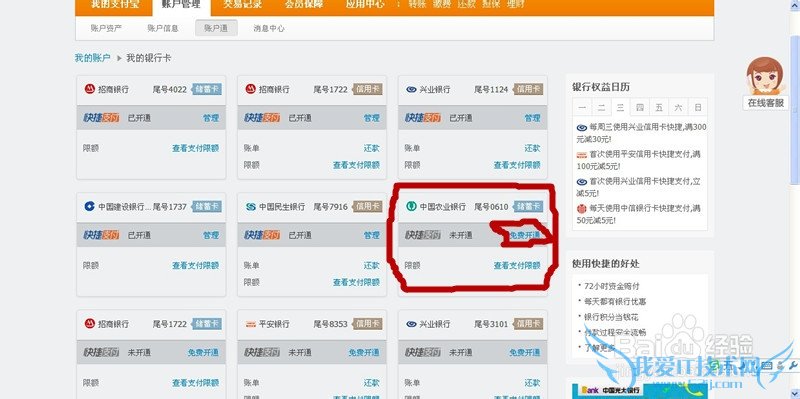 在银行卡管理界面里面就会显示你这个支付宝所绑定的所有银行卡信息了,把鼠标移动到还没开通快捷支付的银行卡那里,点击免费开通快捷支付按钮。