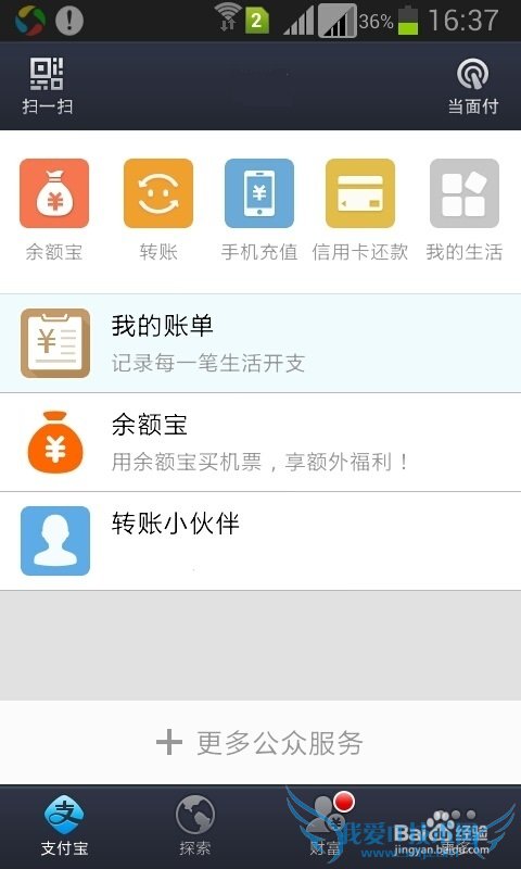 如果没安装支付宝钱包,请百度搜索“支付宝钱包”,安装后,打开界面如下,单击底部“+更多公众服务”;