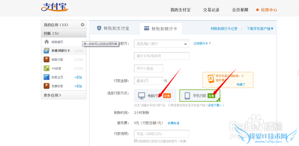 最后,回到支付宝首页,选择转账到银行卡,按照要求输入自己的需要转账相关信息。可以看到,手机付款是免费的,所以选择手机付款。