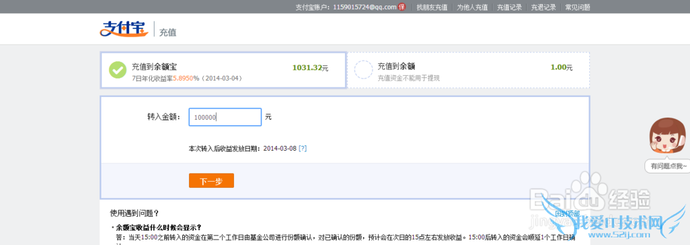 接着将银行卡的钱充值到支付宝,点击“充值”选项,然后输入需要充值的金额,随后点击“下一步”。