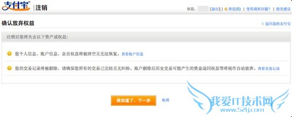 2)如符合注销条件,会进入确认放弃权益页面,点击【我知道了,下一步】。(点击“取消”会退出注销流程,返回自助服务)注:当前页面会提示包括个人信息类、交易记录类,有快捷支付(卡通)的相关权益的提示。